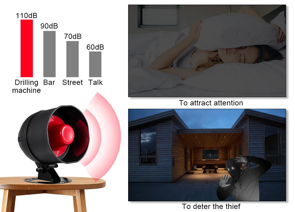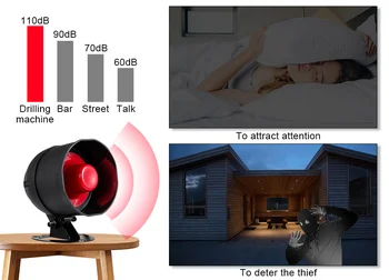 2.When the door sensors ,PIR sensors,curtain detector or other sensor be triggered,this siren will sound